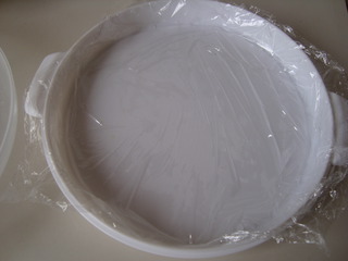4 在器皿内放一层保鲜膜。