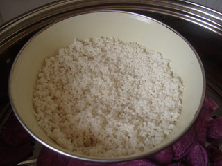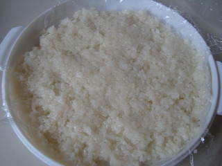 1 糯米浸泡四小时,倒掉一大半水,隔水蒸熟。