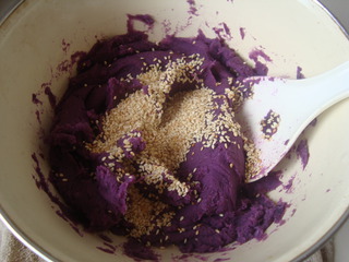 2 紫薯蒸熟,挤压成泥状,加入熟白芝麻,搅拌均匀。