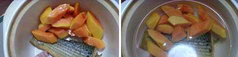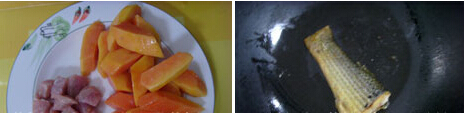木瓜鱼尾汤的材料:木瓜半个,草鱼1条,猪肉50g,食盐5g,姜5g,植物油1茶匙 木瓜鱼尾汤的做法 1.木瓜对剖去皮和籽、切块,猪肉切块,草鱼尾去鳞洗净, 2.锅中放植物油,煎香草鱼尾 家常菜谱 3.木瓜、已煎香的鱼尾、肉和姜片同煮,煮开后,用文火煲1小时,下盐调味,即可用