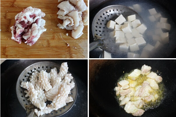 6、烧一些水,沸腾后倒入切成小块的豆腐煮开捞出;