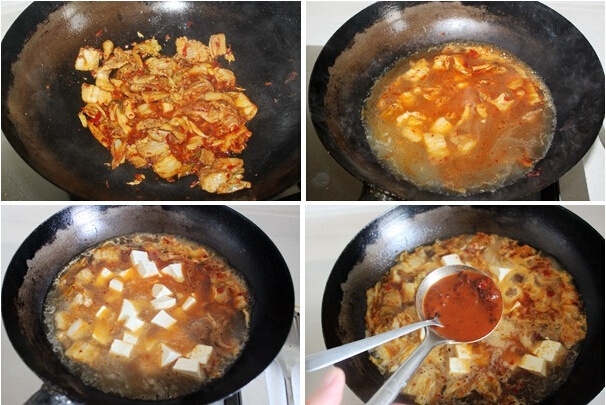 11、然后放入豆腐、将辣椒酱放入汤勺中先用汤调开,然后倒入汤锅中;