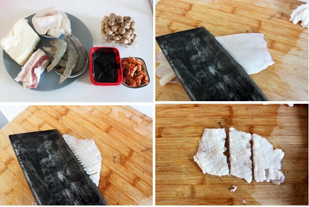 泡菜海鲜豆腐汤的材料:豆腐200g、五花肉100g、虾8个、鱿鱼2条、辣白菜一小碗、韩式辣椒酱1大勺、蘑菇100g、料酒1小勺、大葱1段、料酒少许