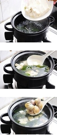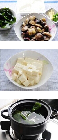 蛤蜊海带豆腐汤的材料:海带,豆腐,蛤蜊,葱花,姜丝,盐,胡椒粉,