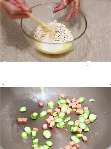 芦笋燕麦煎的材料:芦笋40g,即食燕麦片35g,火腿30g,鸡蛋1个,面粉35g,牛奶80毫升,盐,植物油 芦笋燕麦煎的做法: 1. 芦笋洗净切小片,火腿切小丁 2. 打一个鸡蛋,加入牛奶和燕麦片,搅匀 学做菜 3. 热锅后加入油,放入火腿丁翻炒约30秒,倒入芦笋继续翻炒约1分钟后盛盘备用 4. 在步骤2的中混合液里加入面粉,搅匀,再加入步骤3中炒好的食材,和一点点的盐,继续拌匀 5. 再次热锅,转小火,刷上薄薄的一层油,倒入所有食材,摊开成圆饼。待蛋液表面半凝固时翻面,继续煎约1分钟后,翻面出锅