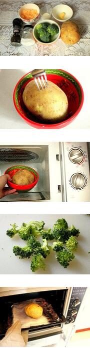 1.土豆洗净,用叉子在土豆表面戳上孔,放进微波炉,高火,约10分钟;同时烤箱220度预热