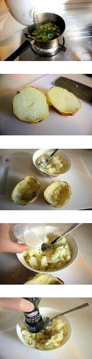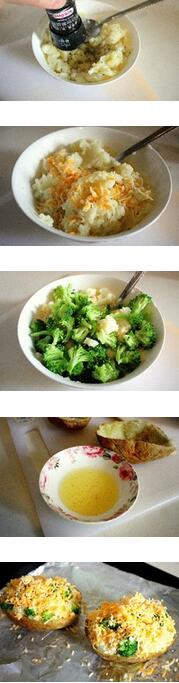 5.烤好的土豆从烤箱取出,切成两半,用勺子将土豆舀出,注意保持土豆皮的完,舀出的土豆用勺子压成泥,加黄油和牛奶,放盐和胡椒调味,加入一部分奶酪到土豆泥拌匀,确保留一部分在碗里待会儿会用到,加入西兰花拌匀