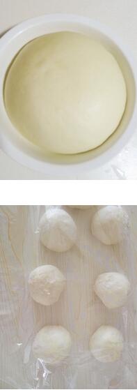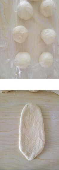 1.用后油法将面包体材料加入到柏翠面包中,直至揉到能抻出大片薄膜的状态,收圆入盆盖保鲜膜于30度左右的温暖处发酵,约50分钟左右发至原体积2-2.5倍大时即发酵完成,分割成7份,滚圆盖保鲜膜醒发15分钟,醒发好的面团擀成椭圆形,自上而下卷起,接口处捏紧,整形成二头比较尖的橄榄形,将面团放在烤盘上在35度左右的环境中再进行最后发酵。