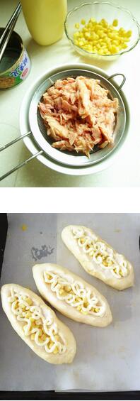 2.将罐头中的金枪鱼肉取出控油,准备好色拉酱及玉米粒,最后发酵40分钟左右发至原体积约2倍大时在面包上先刷一层全蛋液,再用剪刀从中间将面包剪出深度约1/2的切口,放入玉米粒后挤上色拉酱,铺上一层金枪鱼肉后放入预热好202度的烤箱烤15分钟左右即可。