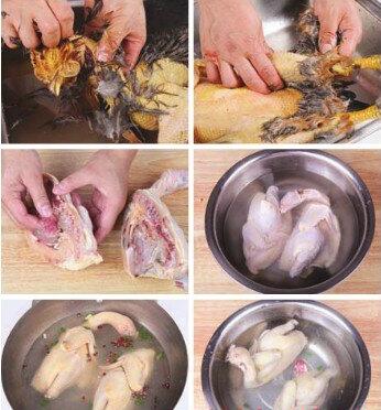 1.将仔鸡宰杀,放入容器内,倒入适星的热水浸泡,再褪去鸡毛后再去掉仔鸡的食管、气管和内脏,放入淡盐水中浸泡并沖洗干净,再放入沸水锅内汆烫出血水, 捞出仔鸡,用冷水过凉。