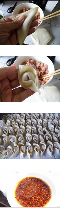 3、将肉馅包入馄饨皮,包成抄手元宝状;