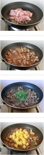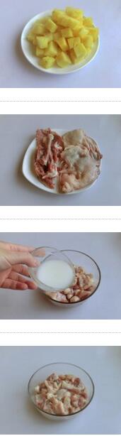 菠萝炒鸭丁的材料:鸭子半只,菠萝半个,甜豌豆50克,油,盐,葱,姜,料酒,生抽,蚝油,淀粉美食网菠萝炒鸭丁的做法:1. 菠萝去皮切丁,鸭子去骨,切丁 2. 将切好的鸭丁放入大碗中,加水淀粉、料酒,盐腌15分钟3. 坐锅倒油烧热后下葱、姜末爆香,倒入鸭丁翻炒,炒到鸭丁变白,调入生抽、蚝油,炒匀,下入豌豆粒,菠萝丁翻炒均匀即可出锅