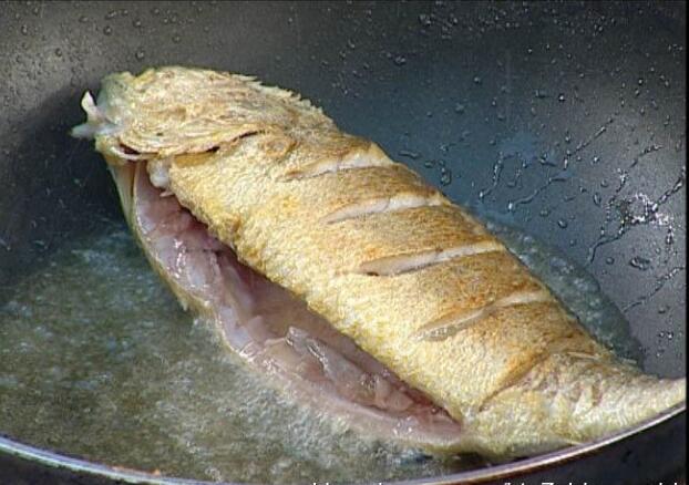 2 坐锅放底油,将腌制好的黄鱼下入锅中进行煎制,一面煎至金黄后翻到另一面,两面煎至金黄后将锅中的油倒出去
