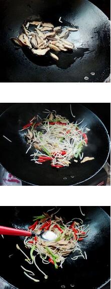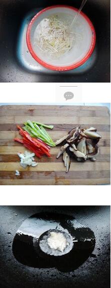 香菇炒豆芽的材料:绿豆芽200g,干香菇四朵,青红椒,盐,蒜末香菇炒豆芽的做法:1 绿豆芽择去根须,放水里冲洗干净并控干水分,香菇泡发后切成片,青、红椒切丝,蒜切碎备用。 2 坐锅倒油烧热,下蒜末炒香,放入香菇翻炒几下,加入豆芽和青红椒丝翻炒,调入盐和少许的味精翻炒均匀即可起锅。美食网