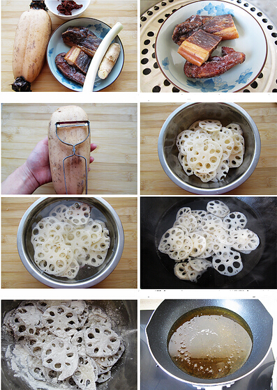 2.坐锅倒油,油六七成热后,将莲藕片下锅炸,炸至莲藕片表面金黄,捞出沥油,另外将蒸好的腊肉切成片