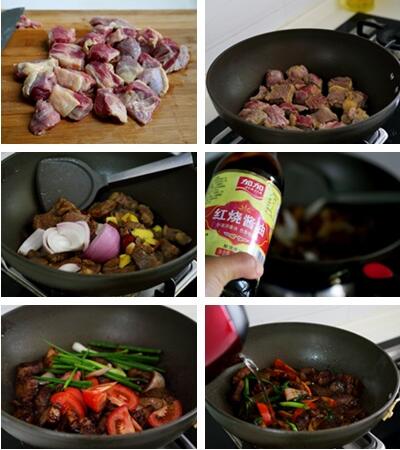 2.取一炒锅,不用油,用中小火将牛肉炒出水分,炒出的水用厨房纸沾去,当水分差不多炒出时,将备好的调料除西红柿和小葱都放入锅中,继续保持中小火炒,当冰糖炒融化加酱油炒均,放入西红柿和小葱,炒出香味加入热水,与肉平齐。