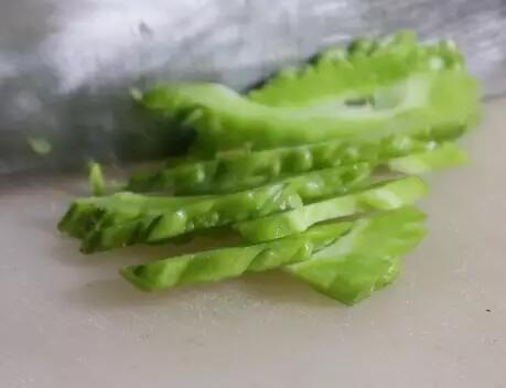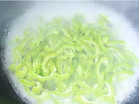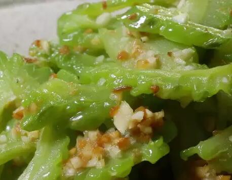 蒜蓉拌苦瓜的材料:苦瓜、葱油、盐、鲜蒜泥、炸蒜泥蒜蓉拌苦瓜的做法:美食网1、苦瓜去头尾,从中破开去籽,洗净改刀切片美食网2、锅中放水烧开下入苦瓜汆水至熟后,取出冷水碗中降温,捞出放入碗中,加入鲜蒜蓉、炸蒜蓉、盐、葱油,充分搅拌装盘 的做法 怎么做好吃