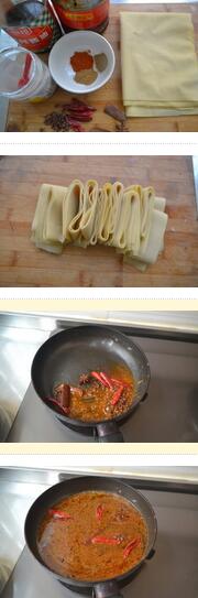 麻辣豆皮的材料:豆腐皮,生抽,老抽,花椒粉,辣椒粉,五香粉,糖,桂皮,八角,辣椒,花椒,盐,鸡精 麻辣豆皮的做法: 1.豆腐皮切成合适喜欢大小 2.热锅凉油爆香,三种混合粉,和其余的香料,加入生抽,老抽,糖,开水做成汁子,加盐和鸡精调味,倒入豆皮,小火煮上15分钟,泡在里面就好。