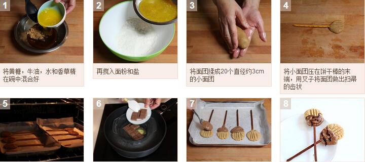 女巫的扫帚的材料:黄糖1/2杯,牛油1/2杯,多功能粉1 1/2杯,盐1/8茶匙,水2汤匙,香草精1茶匙,10根百力滋或者其他的饼干棒,植物起酥油2茶匙,半甜朱古力碎2/3杯