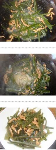 肉丝炒海带丝的材料:海带丝200g,里脊肉100g,油,盐 肉丝炒海带丝的做法: 1. 里脊肉洗净切成丝,海带洗净,把海带切成小段 怎么做好吃 2. 锅中放油,加入肉丝翻炒,加入海带丝,加盐继续翻炒,可以适当的加点水,炒熟出锅即可