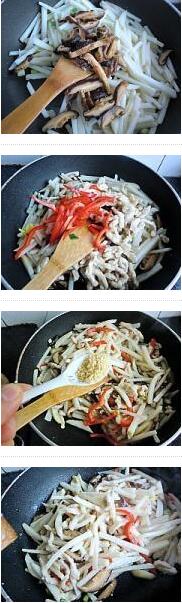 山药炒肉丝的材料:山药300g,里脊肉200g,香菇8朵,红椒,葱姜,盐,料酒10g,糖3g,胡椒粉1g,鸡精1g,淀粉,香,山药,肉丝