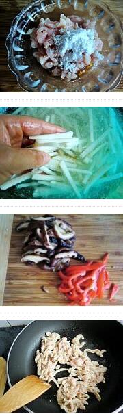 1.香菇提前用清水浸泡,里脊肉切丝加入盐,糖,料酒,胡椒粉,淀粉拌均匀腌制备用,山药去皮切丝用淡盐水浸泡,泡好的香菇切条,红椒切丝。