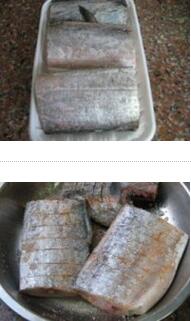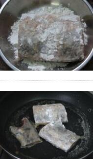 香煎椒盐带鱼的材料:带鱼300克,椒盐,生粉,料酒,姜片, 香煎椒盐带鱼的做法: 1. 带鱼收拾干净,放椒盐、料酒腌1小时,拍上干生粉 学做菜 2. 锅里放姜片爆香,铲出姜片不 要,放带鱼慢火煎熟至金黄色即可出锅