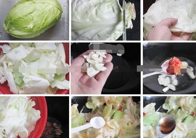 1.将洋白菜(卷心菜)用淡盐水浸泡20分钟,再用流水一片片洗净,撕成大片,沥干水备用,辣椒切小段去籽,姜切片,蒜切片