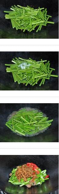 蒜苔炒肉的材料:蒜苔250克,肉丝200克,青红辣椒30克,生粉,生姜20克,老抽,食盐 蒜苔炒肉的制作: 1. 将肉洗净,切成肉丝,肉丝中放入三片生姜、两勺老抽、适量生粉搅拌均匀,腌制10分钟。 2. 将蒜苔洗净,切成一寸左右长的小段。青红辣椒洗净切成丝。 3. 坐锅倒油烧热,下入肉丝滑熟把滑熟的肉丝盛出备用。 家常菜谱 4. 锅内少许底油烧热,放入蒜苔翻炒片刻再加入适量的食盐,翻炒,再加入适量的水,稍煮片刻,待水差不多收干了,放入肉丝和青红辣椒翻炒即可。