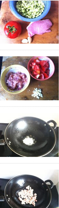 番茄肉末烧毛豆的材料:新鲜毛豆250克,大番茄一个,半肥瘦猪肉末100克,姜末,盐,料酒,生抽 美食网