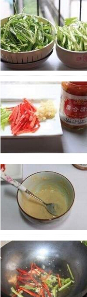 椒丝腐乳通菜的材料:通心菜400克,青红椒各一只,腐乳2-4块,蒜头3粒,油,盐