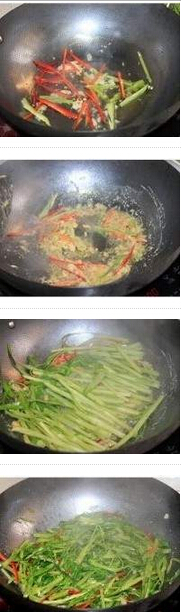 2.坐锅倒入适量油,油要比平常炒菜多一点,通心菜比较吃油,油不够了很容易变黑,油热时候,倒入一半青红椒丝,蒜蓉,爆香后加入腐乳酱翻炒,腐乳炒出香味后,倒入通心菜梗,大火翻炒,1分钟内即可断生,菜梗将要全部断生时,加入菜叶部分和剩余的青红椒丝翻炒均匀,调入盐炒匀即可装盘食用。