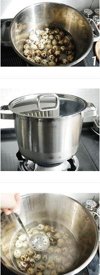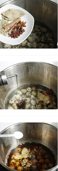 五香鹌鹑蛋的材料:鹌鹑蛋,香叶,小茴香,姜片,老抽,料酒,盐,大料,花椒,桂皮, 五香鹌鹑蛋的做法: 1. 鹌鹑蛋洗干净放入锅里,锅中倒入凉水,水煮开后,关火.盖上锅盖焖上十分钟,这样煮出的鹌鹑蛋不仅好包皮而且省火, 十分钟后打开盖子用勺子在每个鹌鹑蛋上压几下,让它们的外皮出现裂缝. 美食网 2. 重新打开火,将大料,花椒,桂皮,香叶,小茴香,姜片放入锅中煮十分钟,倒入适量的料酒,酱油,临关火的时候放入盐.全部调好味后,关火,盖上锅盖焖至鹌鹑蛋和汤汁变凉.