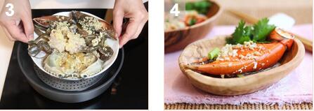 薑米花雕蒸肉蟹的材料:肉蟹1只(我们也称作花蟹),姜20克,葱20克,香菜10克,蒜1粒,中式料酒45mL,鱼露25mL,油40mL 薑米花雕蒸肉蟹的做法: 1. 葱和香菜切碎,姜和蒜捣碎,在碗中将调味料同姜蒜混合。 3. 螃蟹洗净斩段,然后淋上调味料,隔水高火蒸8分钟,最后加上葱花和香菜出锅。
