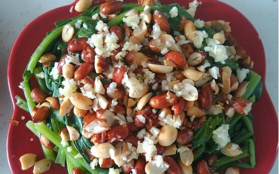 麻酱拌菠菜的材料:菠菜400g,花生仁(油炸)50g,食盐4g,香油5g,姜1块,蒜1瓣,芝麻酱1勺,水, 麻酱拌菠菜的做法: 1.准备好材料洗净备用 2.姜、蒜瓣剁成末 3.油炸花生米稍微碾碎 天天美食 4.锅里放入适量水,加入食盐、香油烧开 5.加入菠菜焯水 怎么做好吃 6.菠菜捞出装盘,放入油炸花生米和姜蒜末 怎么做好吃 7.取适量芝麻酱加入食盐、香油,加入少许凉开水搅拌 8.分次加入凉开水朝一个方向搅拌,将芝麻酱充分打匀 9.淋入芝麻酱就做好了 怎么做好吃