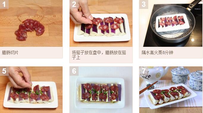 腊味清蒸茄子的材料:腊肠1根,茄子1根, 蚝油酱材料:蚝油1汤匙,芝麻油1茶匙,水20mL 腊味清蒸茄子的做法: 1. 茄子切成约1cm厚的条,腊肠切片。 2. 将茄子放在盘中,腊肠放在茄子上。隔水高火蒸8分钟。 3. 当蒸茄子时,将蚝油,芝麻油,水在小碗中混合均匀。 4. 将蚝油淋在蒸好的茄子上,撒上葱花,即成。