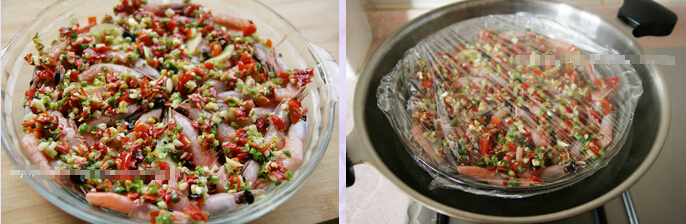 剁椒北极虾的材料:野生北极虾1斤、丝瓜1根、剁椒2汤匙、黄酒2汤匙、香葱1小把、蒜、姜片、糖1小勺、盐 剁椒北极虾的做法: 1、香葱、蒜切碎粒,姜切片,丝瓜刮去皮后,切成厚约1公分的片。 2、将丝瓜片码在盘子底部,将北极虾码放在丝瓜片上,并铺上姜片。 怎么做好吃 3、碗中放中剁椒、葱蒜粒、糖、盐、黄酒,将碗中调料轻拌匀。 4、将调料撒在北极虾上,将盘子放入已上汽的锅中,大火蒸8分钟后即可。