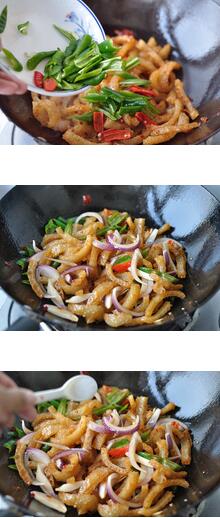 酸辣肉皮的材料:炸猪皮,洋葱, 青椒,姜片,盐,陈醋 酸辣肉皮的做法: 1.炸猪皮用开水煮过后用清水浸泡数小时,直至猪皮膨胀有弹性。 怎么做好吃 2.洋葱去皮切成条。青椒洗净,去籽后切成小段。把泡好的猪皮切成细条。 3.起油锅,放入姜片爆香。放入一汤匙红油豆瓣酱,炒出红油。倒入切好的炸猪皮,翻炒均匀。把切好的青椒段倒入锅里炒匀。放入洋葱,快速翻炒。调入适量精盐。沿锅边烹入两汤匙陈醋,过火,翻炒均匀即可出锅。