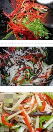 五彩藕丝的材料:青红椒,嫩藕,水发木耳,嫩姜,味精,白糖,白醋,花椒油 五彩藕丝的做法: 1.锅中加水烧沸,倒入藕丝煮二分钟后捞出放入凉水中 2.木耳丝倒入煮过藕丝的锅中焯水后捞出放入藕丝中过凉水,然后一同捞出沥干水,放入碗中 3.锅置火上,放油烧至五成热,倒入姜丝、青红辣椒炒出香味,倒入藕丝、木耳丝,加入盐、味精、白糖、白醋、花椒油拦匀装盘上桌 美食网