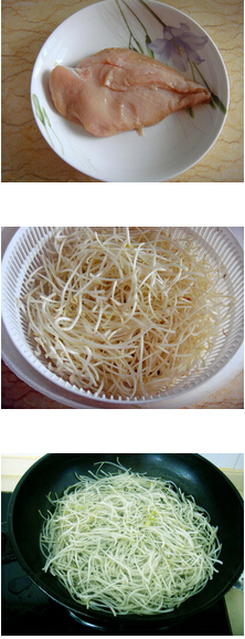 炝拌鸡丝绿豆芽的做法: