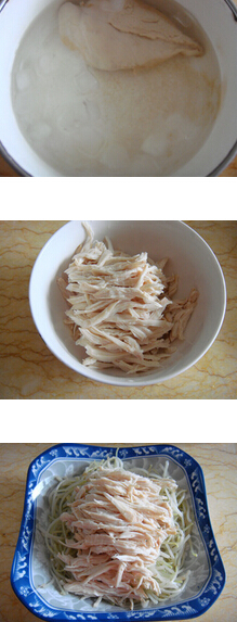 3.再用清水加八角,桂皮,大火烧开后,倒适量料酒,放入鸡肉,15分钟后,捞起放进冰水中过凉2分钟,捞起把它撕成鸡丝