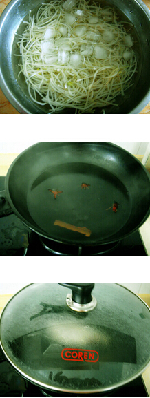 2.锅内加清水大火烧开后倒入绿豆芽绰水至沸腾关火,迅速捞起倒在冰水中过凉。这样吃口很脆。