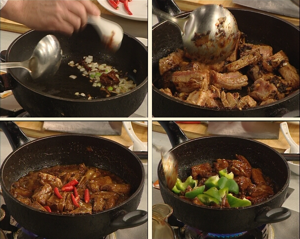 酱焖辣排骨的材料:排骨 辣椒 小米辣椒 青椒 豆瓣酱 蚝油 蒜末 料酒 糖 水 酱焖辣排骨的做法: 一: 锅中放入花椒大料干焙,出香后放入油,放入葱姜煸炒,然后放入豆瓣酱,甜面酱,蚝油,炒香,放入蒜末 学做菜 二:排骨沾干水分,放入锅中翻炒,放入料酒,加糖,加水 三:最后放入小米辣椒,放入青椒加香油即可出锅