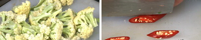 1、青、红杭椒洗净切成小段;菜花去根,切成小块,洗净后控干水分。