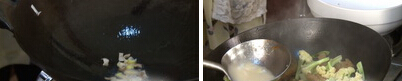 6、锅烧热,加入一勺凉油滑透,将油倒出,留少许底油,下入葱花、姜片炸香,调入生抽,下入菜花和蛰头炒匀,将调好的汤汁搅匀后倒入锅中,翻炒均匀。