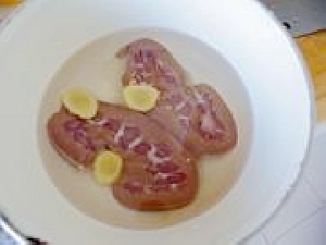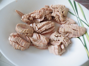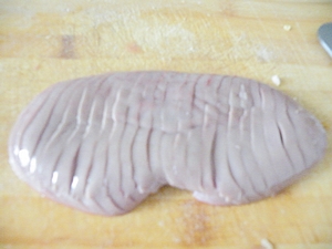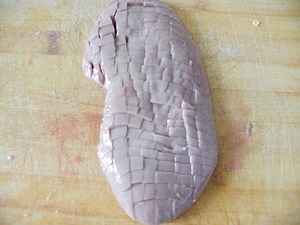 猪腰子在进行刀工处理时,应撕去外皮,片净腰臊。改刀时,刀距应均等,深度一致,直刀为原料的4/5,斜刀略浅,每片腰子以改四刀为宜,俗语有“烧三熘四”之说,烧,指烧腰花:熘,指熘腰花。这句话的意思是:做“烧腰花”时直刀的刀距略宽一些,每片腰花是三刀,而“熘腰花”刀距较密,每片腰花为四刀;