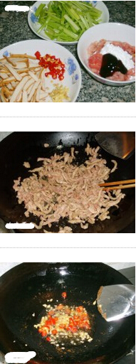 香干芹菜炒肉丝的材料:瘦肉300克,芹菜50克,香干200克,姜,泡椒,食用盐,干淀粉,蚝油,鸡精,色拉油,清水少许 香干芹菜炒肉丝的做法: 1.瘦肉切丝,加干淀粉、蚝油及少许清水拌匀稍稍腌一会儿;芹菜切寸断;香干切长条;姜切成末;泡椒切开。 2.炒锅倒油,开小火,下肉丝,用筷子将其扒拉散,至肉丝变色后将其捞出控油。 3.锅内留底油,下姜末及泡椒末炒香。 4.下香干翻炒。 5.加少许盐炒约1分钟后下芹菜,大火爆炒约半分钟。