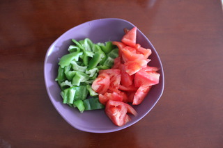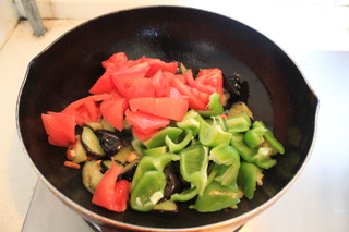 放青椒和西红柿,加一勺白糖和适量的盐调味,大火翻炒均匀,中途可以少加一点热水炒制西红柿变软出现红色汤汁。