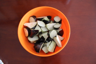茄子洗净切滚刀块后均匀的撒上些盐腌制10-20分钟。