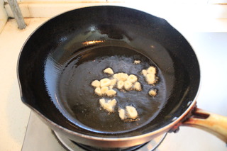平底锅热后放适量的花生油,然后放蒜瓣爆香。